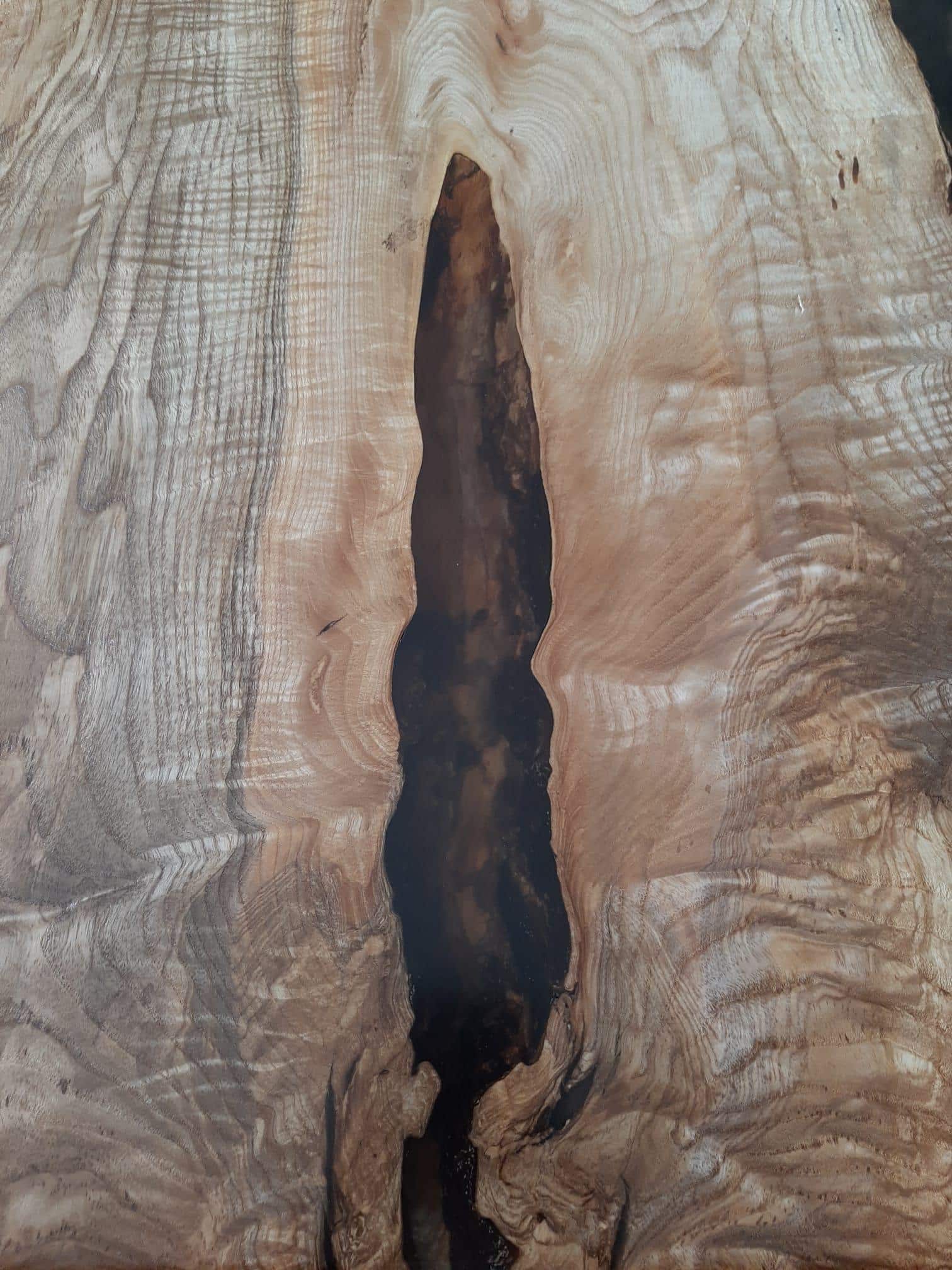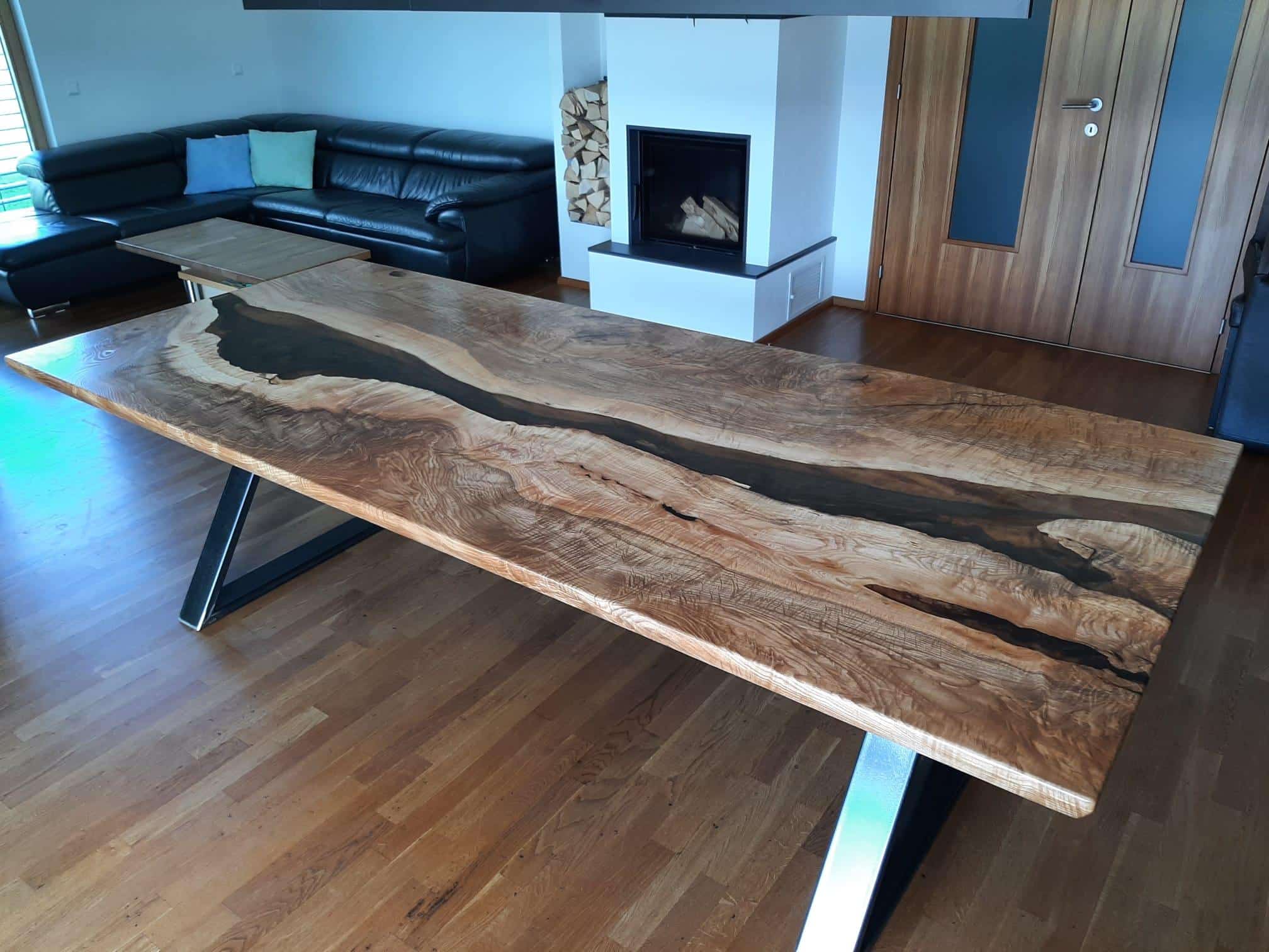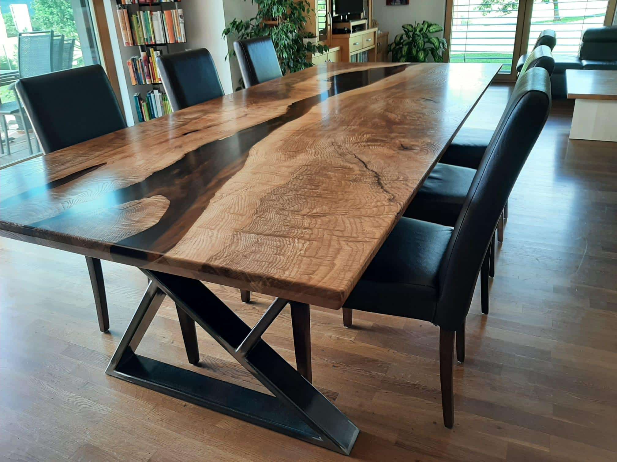 Diese Bilder sprechen für sich! lebendig, feurig, wild, stylisch, elegant und sehr modern. Esstisch aus heimischer Esche mit einer absolut sensationellen Struktur und Maserung. Als erste und unterste Schicht habe ich eine metallic Braun Resin verwendet damit der Tisch nicht durchsichtig ist. Danach habe ich den Rest mit transparentem Resin aufgefüllt um die Waldkante als 3D Effekt sichtbar zu machen. Abgerundet mit einer „schweizer Kante“. Die Platte wurde lackiert.