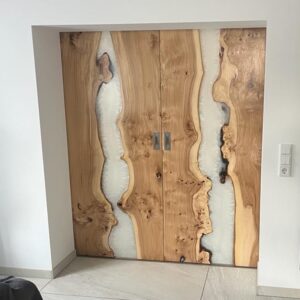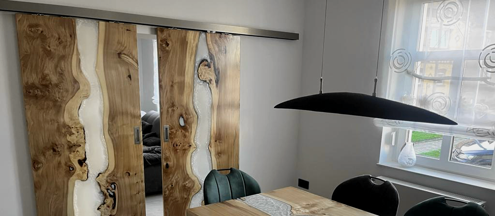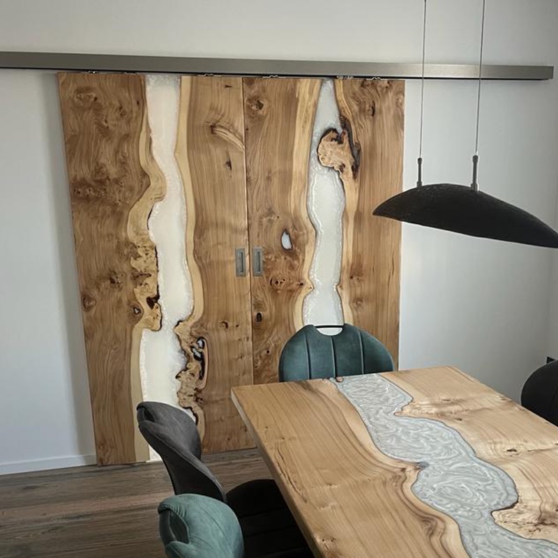 Unsere Schiebetüren werden aus einem oder zwei Elementen gefertigt, je nach gewünschter Breite. Wählen Sie aus verschiedenen Holzarten und Epoxidharzfarben, einschließlich transparenter und semi-transparenter Optionen, um Ihre individuelle Tür zu gestalten.